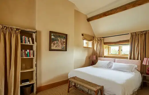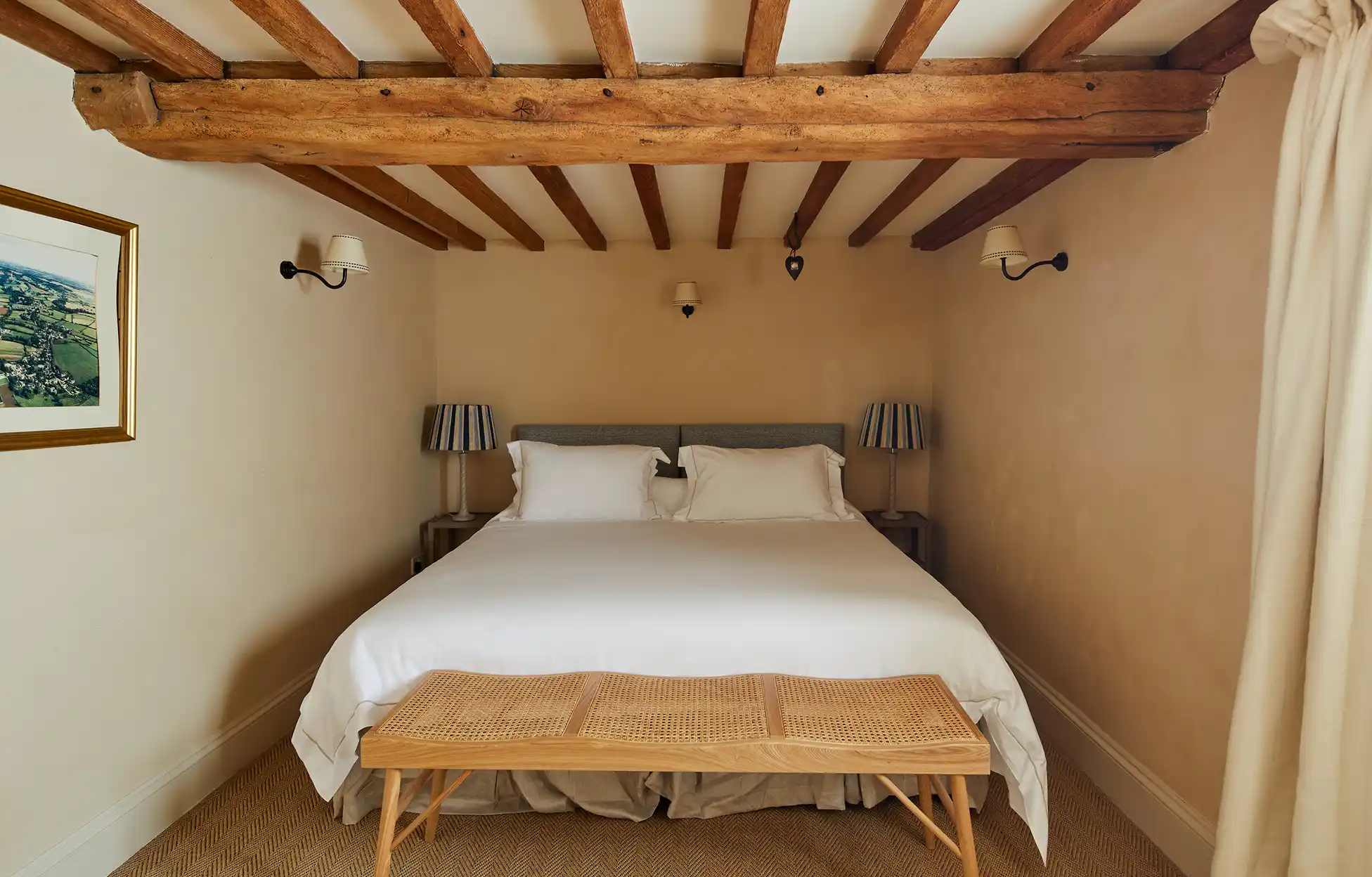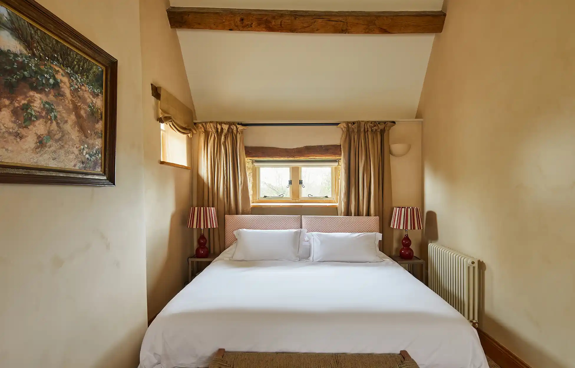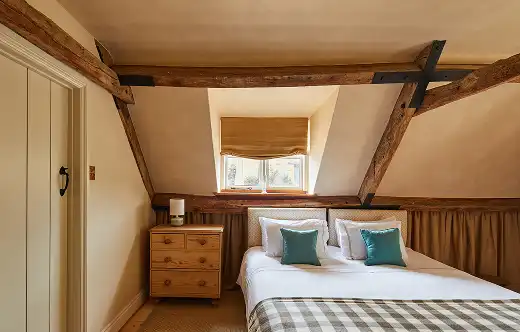 The only bedroom on the ground floor, it features exposed beams and soft natural light. It has access to a bathroom with a shower a short way down the hall. Easy access makes it ideal for elderly guests or those with limited mobility.