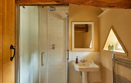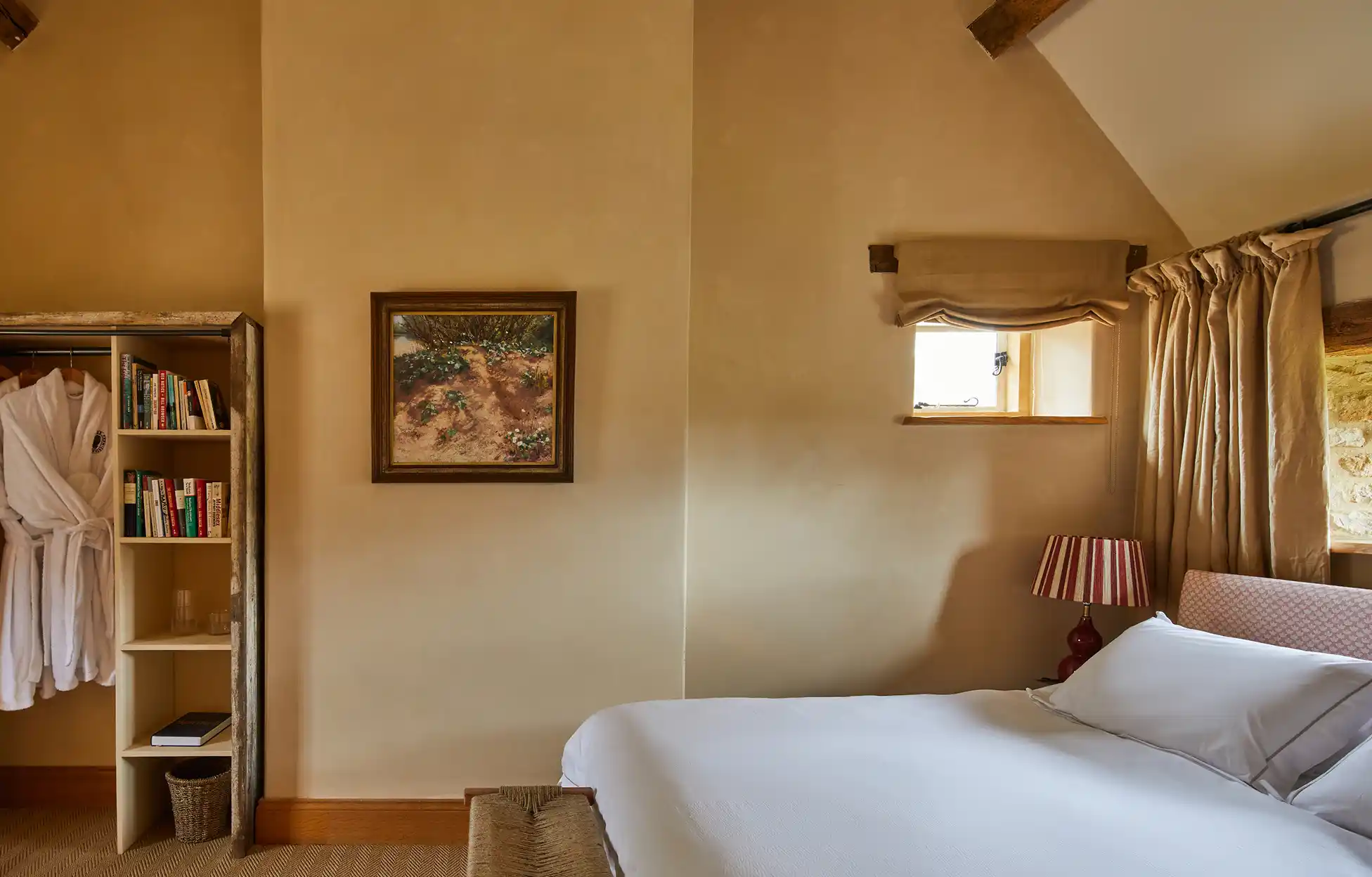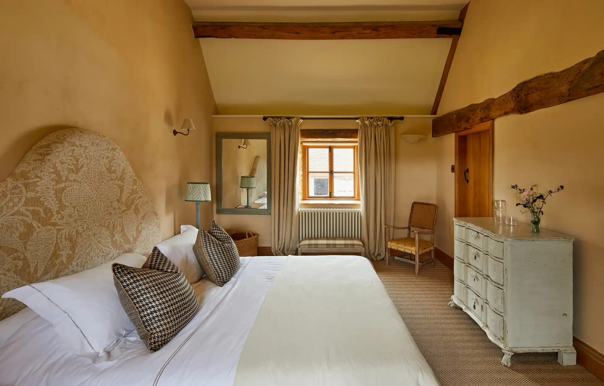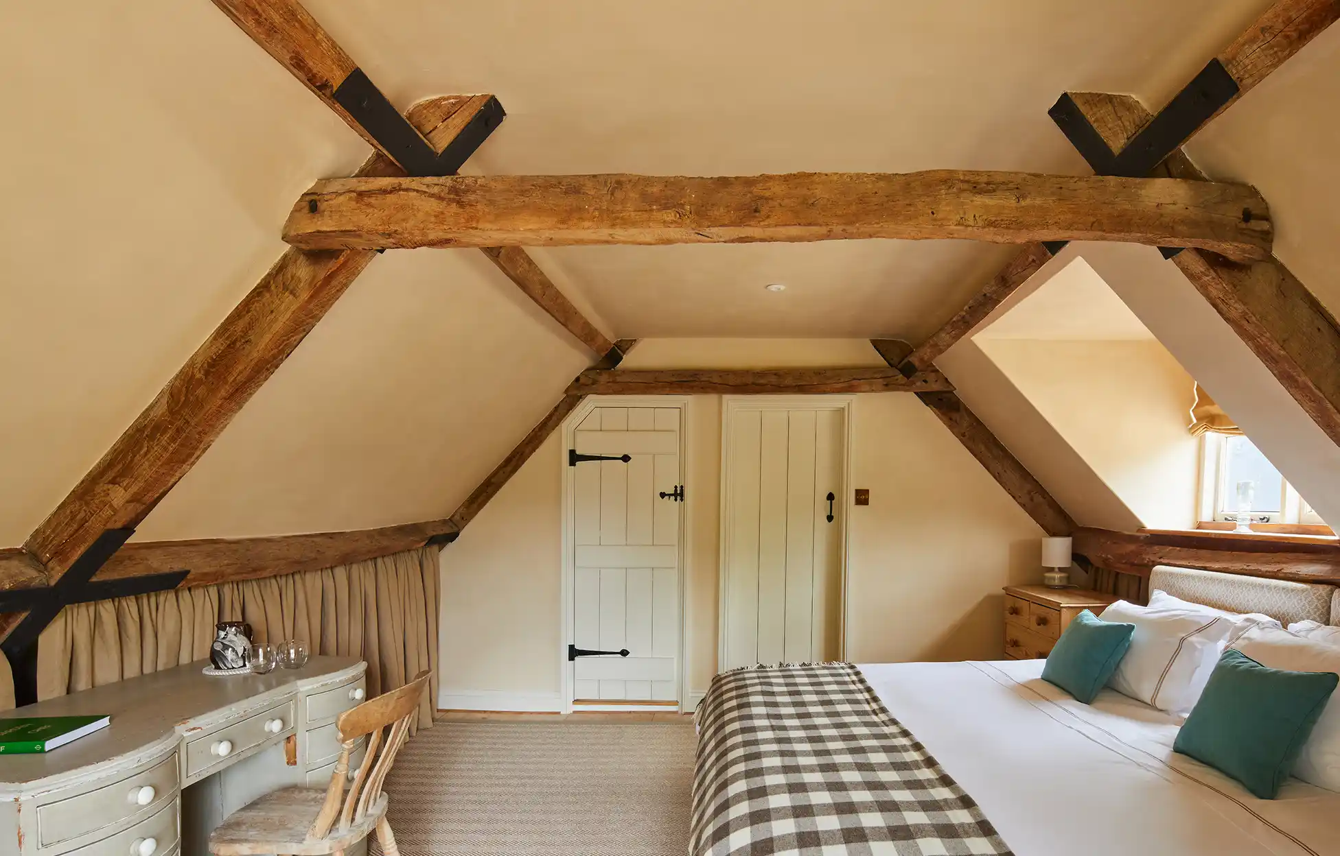 The only bedroom on the ground floor, it features exposed beams and soft natural light. It has access to a bathroom with a shower a short way down the hall. Easy access makes it ideal for elderly guests or those with limited mobility.