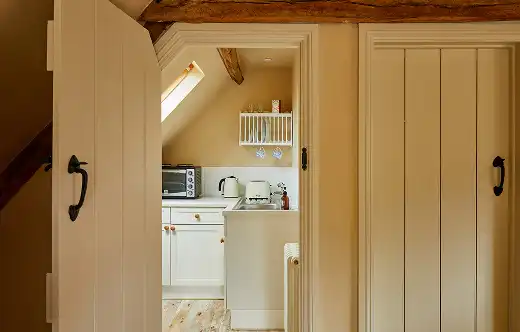 Known as the Annexe, this cosy room is accessed via external stairs and features natural light, characterful touches, an en suite bathroom, and its own private kitchenette.