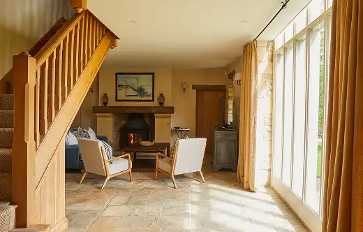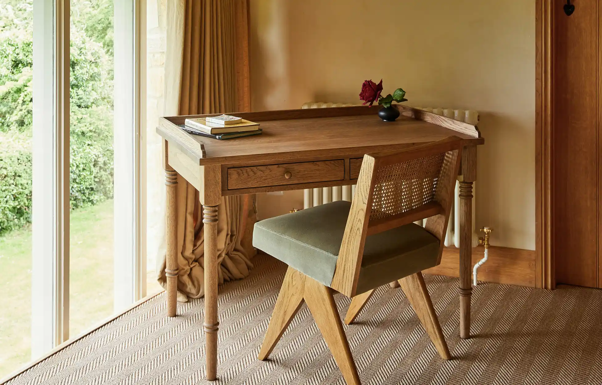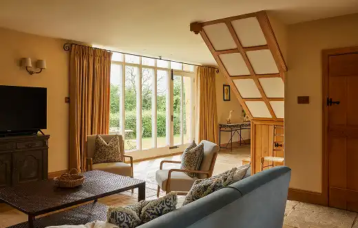 A welcoming living and working area, blending comfort and natural light, perfect for relaxing, reading, or getting inspired by tranquil garden views.