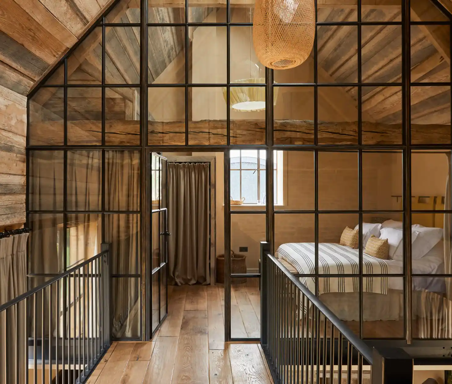Converted in 2023 from a former farm building, the Stone Barn is a beautifully finished two-bedroom dwelling that combines original character with considered, contemporary design. Features include Crittall windows, a preserved hay rack in the kitchen, and a mezzanine bedroom that overlooks the main living area. Inside, the barn is light-filled and inviting, with soft textures, natural finishes, and thoughtful details throughout. The living space features a wood burner set into Cotswold stone, access to all major streaming services, and a Sonos sound system.