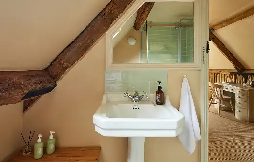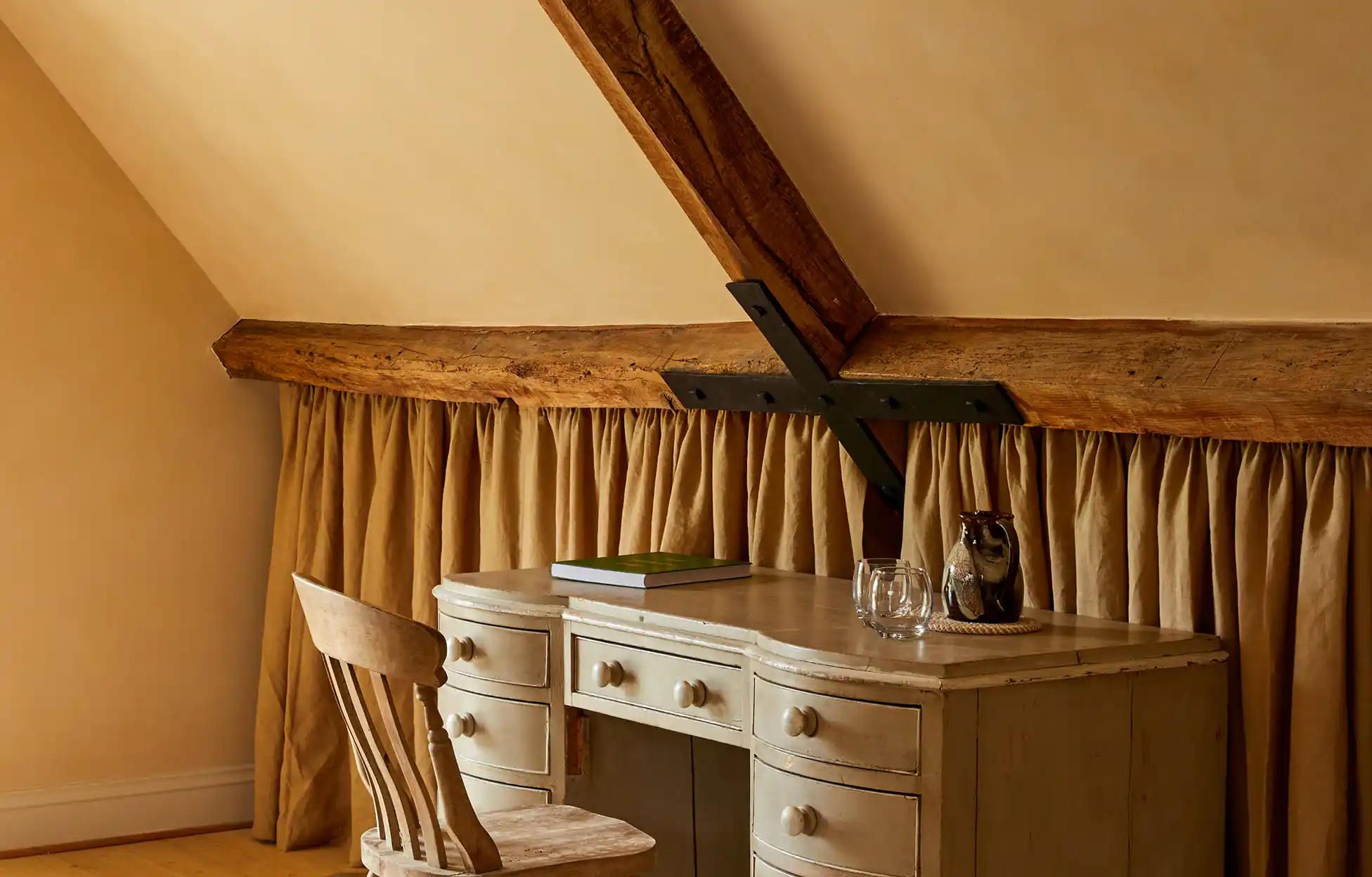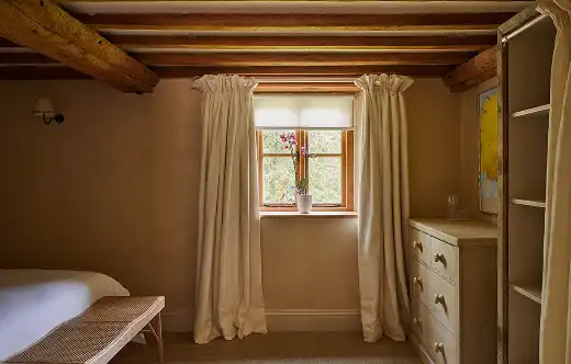 The only bedroom on the ground floor, it features exposed beams and soft natural light. It has access to a bathroom with a shower a short way down the hall. Easy access makes it ideal for elderly guests or those with limited mobility.