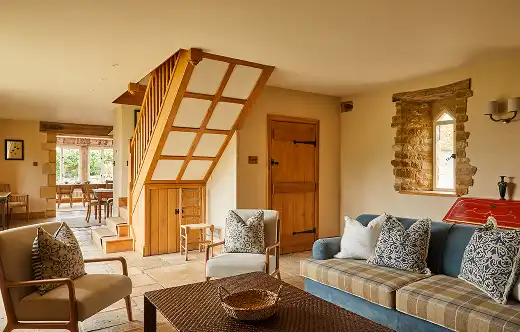 A welcoming living and working area, blending comfort and natural light, perfect for relaxing, reading, or getting inspired by tranquil garden views.