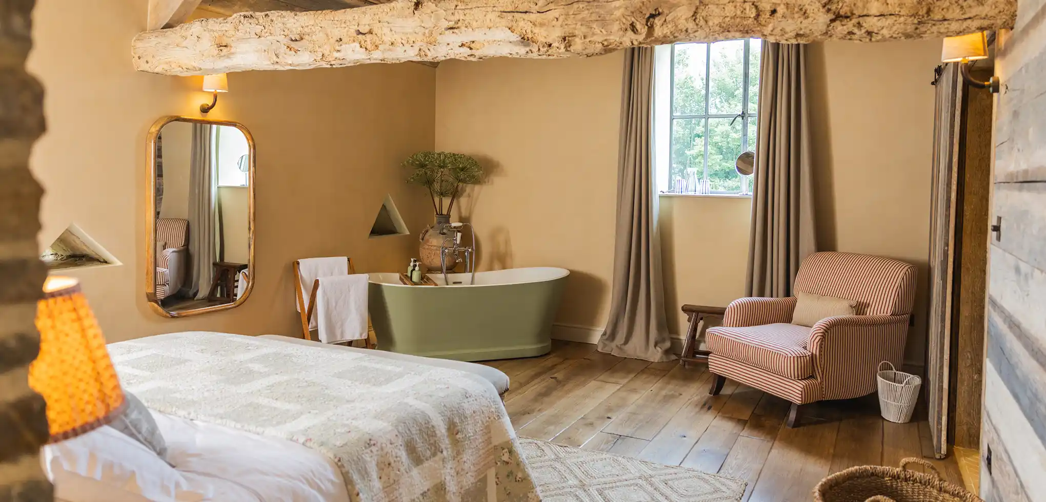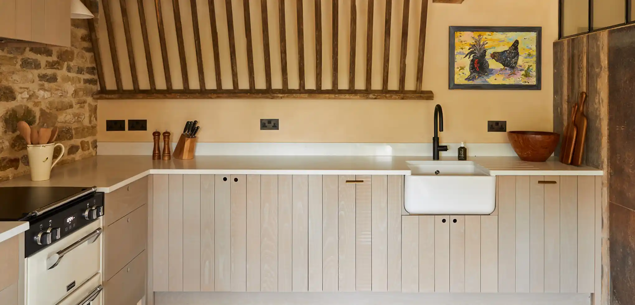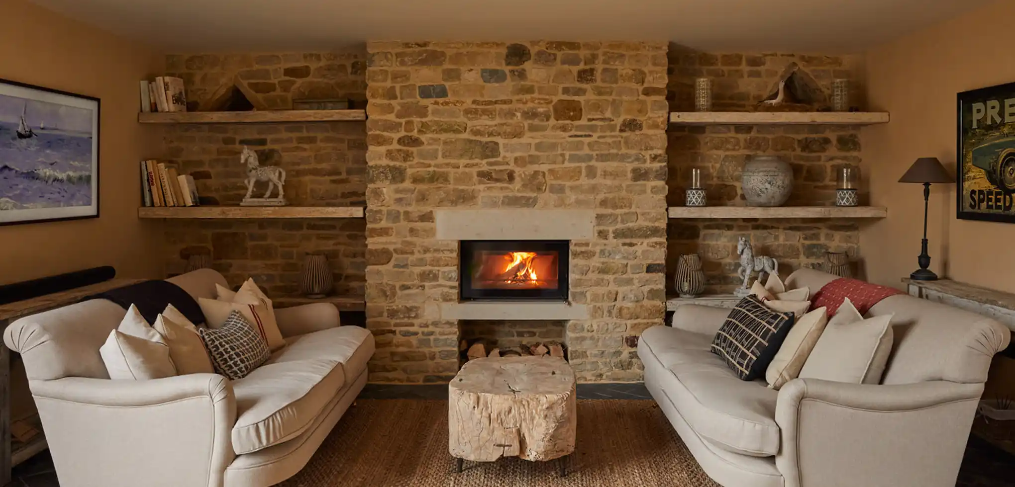 Converted in 2023 from a former farm building, the Stone Barn is a beautifully finished two-bedroom dwelling that combines original character with considered, contemporary design. Features include Crittall windows, a preserved hay rack in the kitchen, and a mezzanine bedroom that overlooks the main living area. Inside, the barn is light-filled and inviting, with soft textures, natural finishes, and thoughtful details throughout. The living space features a wood burner set into Cotswold stone, access to all major streaming services, and a Sonos sound system.